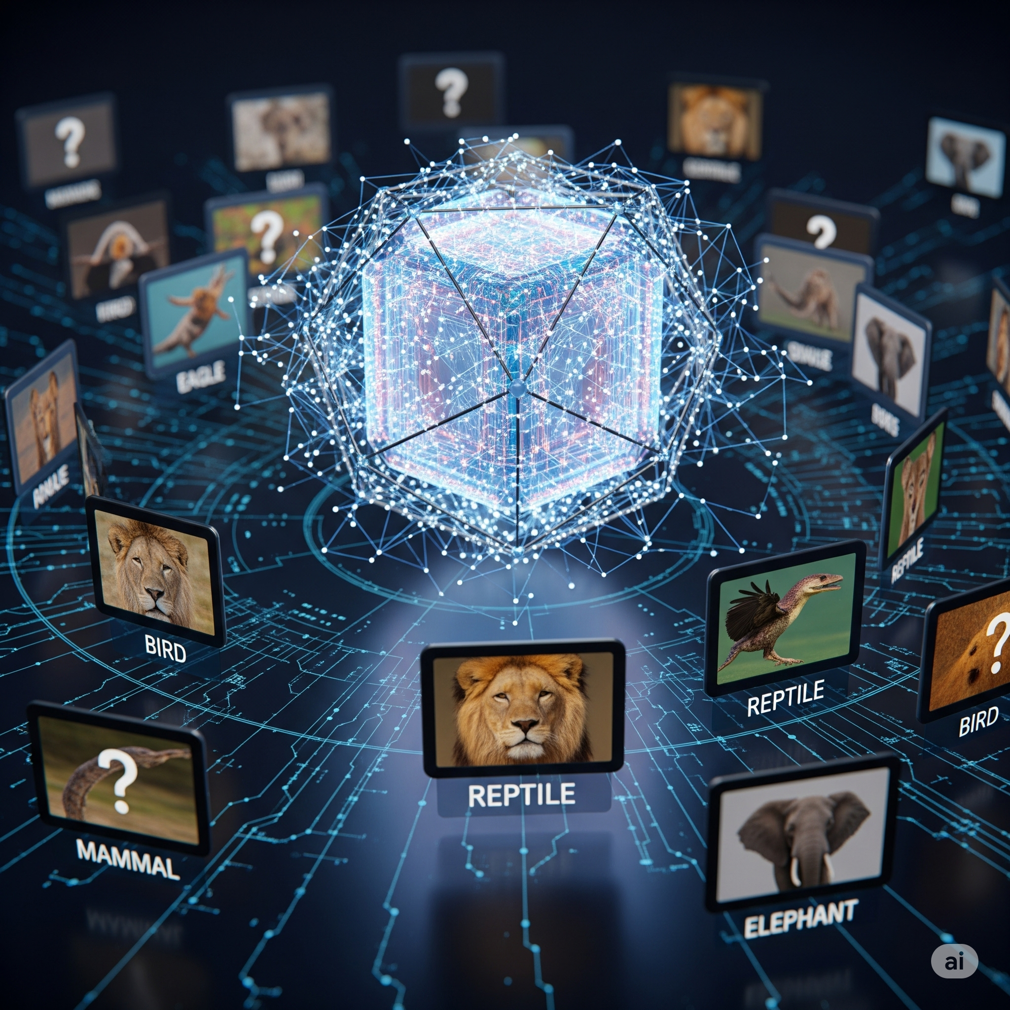AI에게 수만 장의 동물 사진을 무작위로 제공합니다. 사진에 "강아지" 또는 "고양이"라는 라벨은 전혀 없습니다. AI는 사진들을 탐색하면서 "귀가 뾰족하고 수염이 긴 사진"들을 한 그룹으로 묶고, "털이 복슬복슬하고 코가 뭉툭한 사진"들을 다른 그룹으로 묶습니다. AI는 이것이 각각 고양이와 강아지인지 모르지만, 스스로 특징을 기준으로 데이터를 분류하는 것이죠. 이처럼 스스로 데이터를 묶는 과정을 **'클러스터링(Clustering)'**이라고 부릅니다.