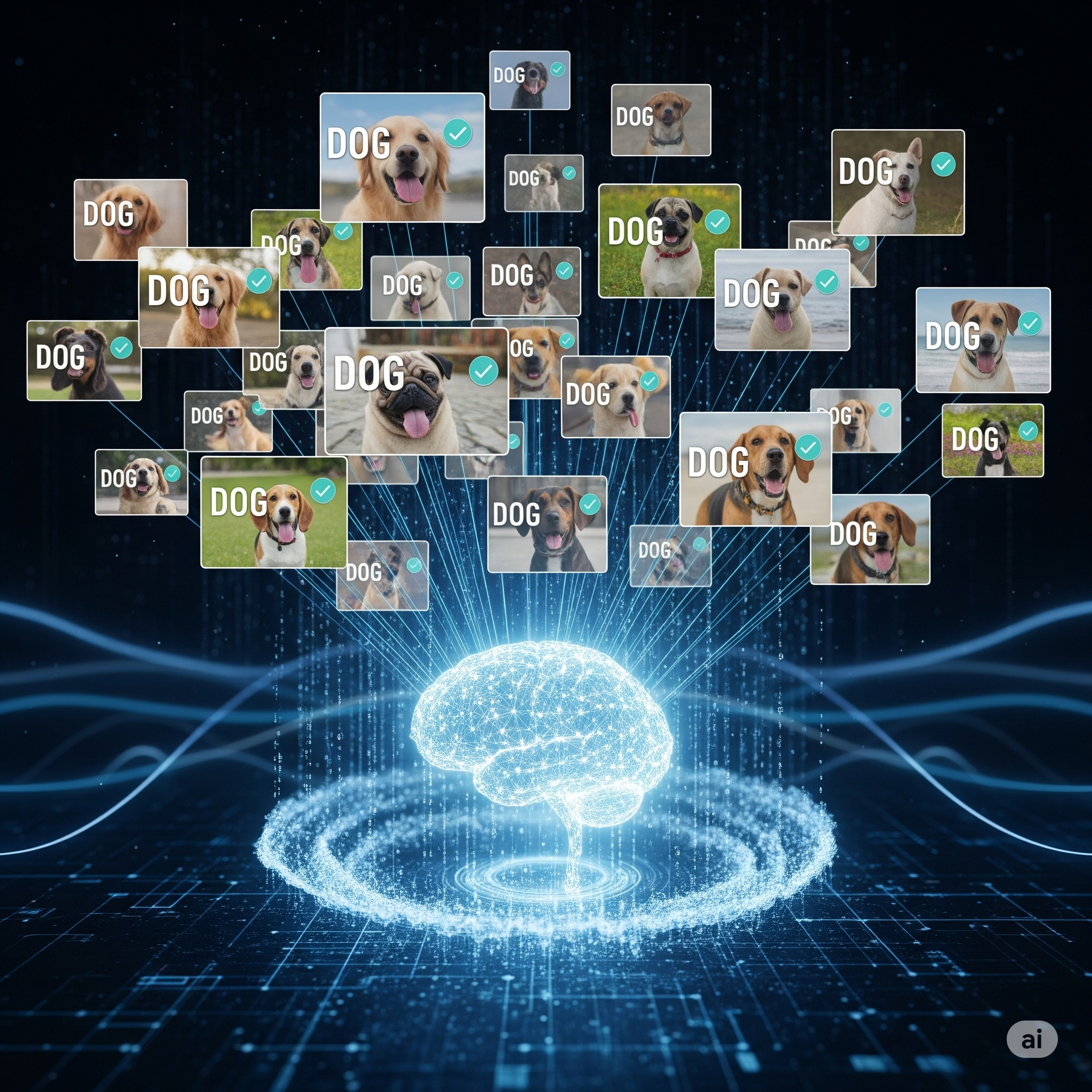 AI에게 수만 장의 사진을 보여주면서 "이건 푸들, 이건 시바견, 이건 골든 리트리버"라고 정확한 품종 정보를 함께 제공합니다. AI는 이 데이터를 학습하여 새로운 강아지 사진이 들어왔을 때, 이전에 배운 데이터를 바탕으로 "이 사진은 골든 리트리버일 확률이 98%야"와 같이 품종을 정확하게 예측합니다.